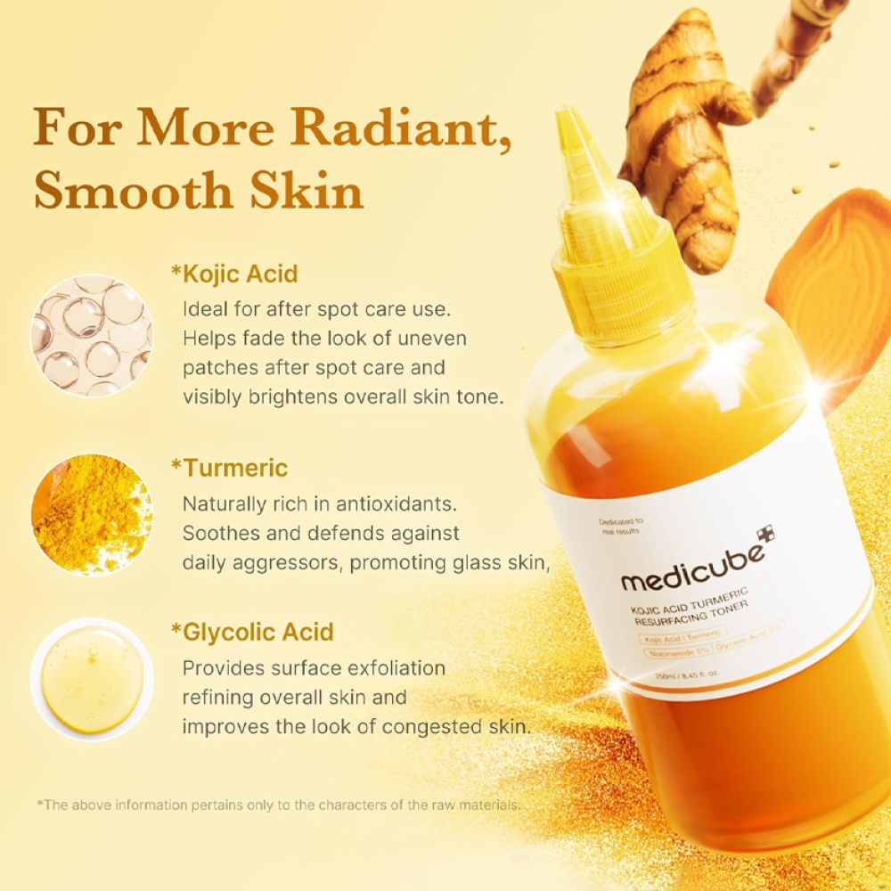 - Apply Medicube Kojic Acid Turmeric Toner 250ml on a cotton pad or hands